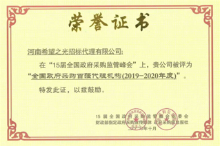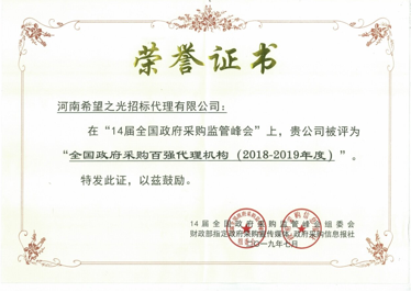 (**政府采购百强代理机构是由政府采购信息报、政府采购信息网联合选取,**范围内遴选100家代理机构,河南省入围7家,获此殊荣视为招标代理行业**高荣誉)