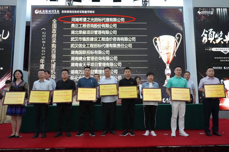 全国政府采购百强代理机构获得者,获奖现场第一名--河南希望之光招标代理有限公司